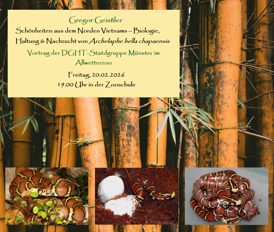 | 20.02.2026 | Gregor Geisler | Schönheiten aus dem Norden Vietnams – Biologie, Haltung und Nachzucht von Archelaphe bella chapaensis. |